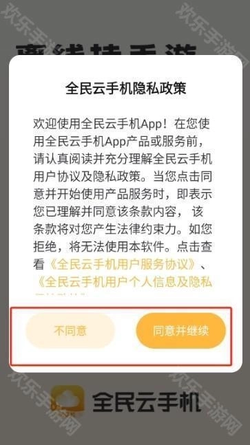 2、进入后阅读并同意全民云手机的用户协议。
