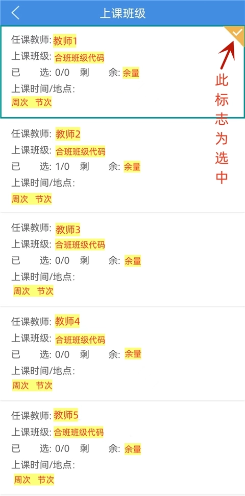 5、检索找到课程后,点击【点此选择认可教师及上课班级】按钮,即可进入上课班级界面。