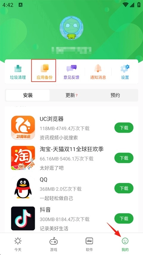 1、打开豌豆荚,点击我的-应用备份;