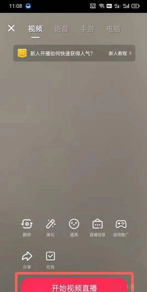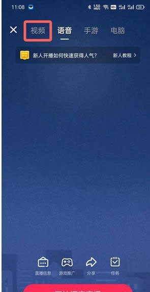 4、每次进入时默认开启语音直播,需在上方切换至【视频】模式。