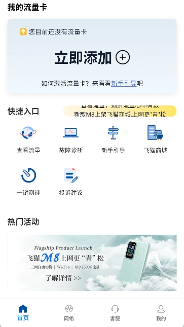 飞猫管家是一款功能丰富的家庭网络管理软件,能让我们轻松掌握所有联网设备的状态,实现实时监控与远程操控。例如外出时担心家中情况,可借助智能摄像头实时查看,一旦出现异常会立即发出警示。另外,在飞猫管家平台上还能随时查询家庭流量使用情况,流量不足时也能直接充值。