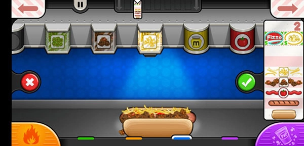 游戏设有不同的难易度梯度:初期阶段,可供制作热狗的食材种类较少,顾客的需求也相对基础,同时客流量不大,因此前期的热狗制作环节较为简单,每一份成品都需要玩家通过鼠标操作逐步完成。 随着游戏进程推进,热狗的食材配料种类会逐渐丰富,顾客的需求也开始变得多样化,甚至还会出现用餐高峰期。在规定时间内的具体制作流程如下:首先需要取出一个热狗面包,接着将作为热狗灵魂的热狗肠放置在烤盘上烤制至熟——这里要特别注意烤肠的时间,一旦烤糊,将其丢弃到垃圾桶会导致金币收入被扣减。烤好的热狗肠放在面包上后,需根据顾客的口味进行配料添加:比如喜欢全料的顾客,就依次放上芝士、牛肉和番茄酱;若顾客对其中某一种配料有忌口,则需将其剔除,最后把制作好的热狗放入装饰盒中即可递送给顾客。