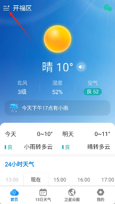 4、在首页点击左上角的“三横图标”进入城市管理页面。