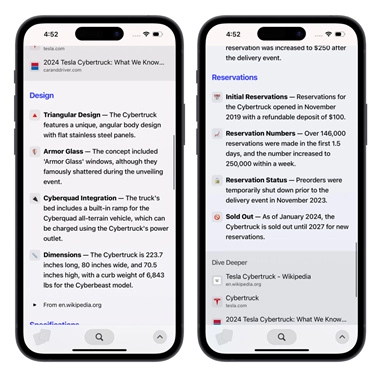 5、所有涉及特斯拉Cybertruck的项目都会自动为你以条列形式整理妥当,并且会生成对应的标题与项目内容。滑动至页面底部即可查看相关网页链接,点击上方的附图便能直接跳转至该图片所属的网页。