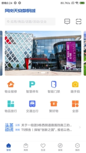 为企业和个人提供招商租赁、物业管理、安防门禁、智慧停车、园区服务、企业服务、在线缴费、日常消费、社交活动等服务。