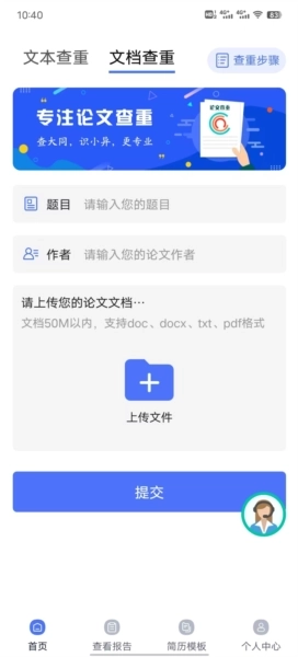 文本查重内容字数在500字~10000字;文档查重文档在50M以内,支持doc、docx、txt、pdf格式。