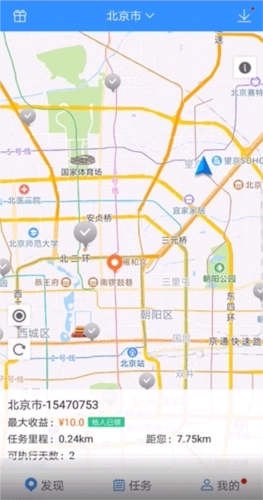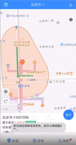 3、点击“执行任务”进入任务操作界面,其中红色路线对应的是2元任务,蓝色路线对应的是3元任务