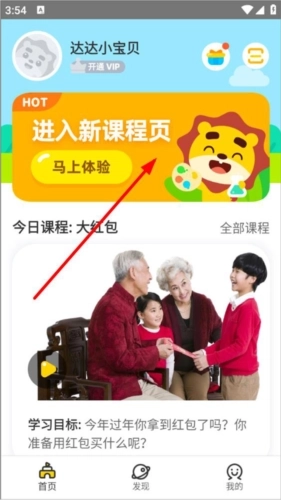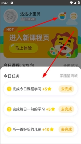 1、打开学趣乐园并登录进入首页,首页设有新课程体验、今日课程和全部课程的功能栏,点击右上角的礼品盒图标即可查看每日任务;
