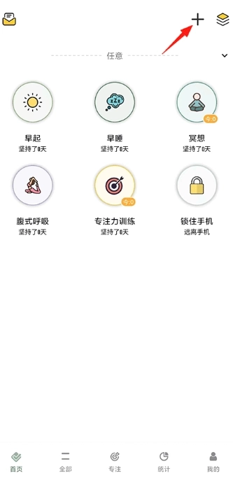 1、打开小习惯应用进入首页,点击页面右上角的+按钮,即可进入自定义添加打卡项目的习惯设置界面。
