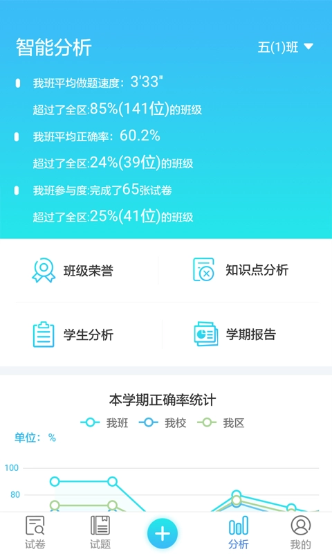 1、分析:查看学生作业的完成情况、成绩的分布情况、与其他班级和学校的对比情况,以及每道试题的正确率分析与对比。