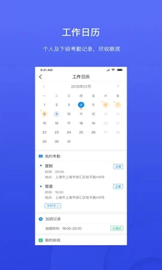 2、支持在线提交休假与加班申请,是商务办公场景下的实用辅助工具。