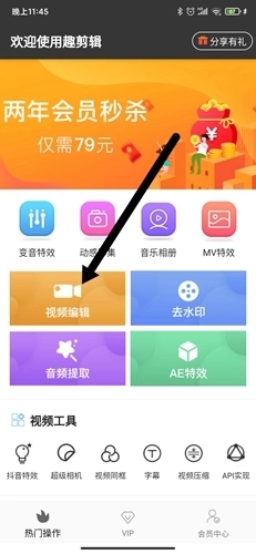 首先我们启动软件,在软件的【热门制作】板块里,我们点击选择【视频剪辑】选项。