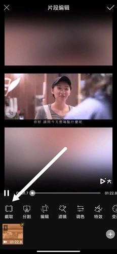 在软件的编辑界面中,我们先点击分段编辑功能,接着选择截取选项,随后选定视频里的一段区域并点击确定,这样就能完成视频截取的操作了。