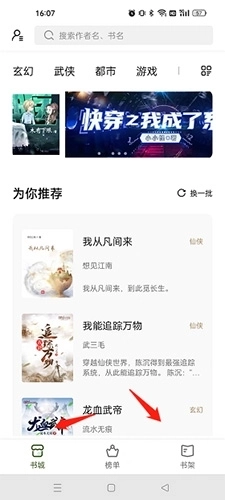 1、打开软件,点击底端的“书架”或者“书城”选项,选择自己喜欢的小说。
