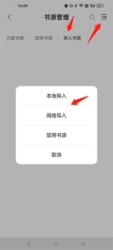 2、点击“导入书源”选项,然后点击“更多”按钮,选择本地导入或者网络导入。