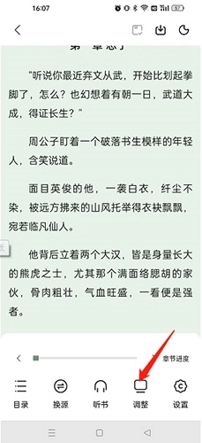2、进入阅读页面,点击空白处,然后点击“调整”选项。