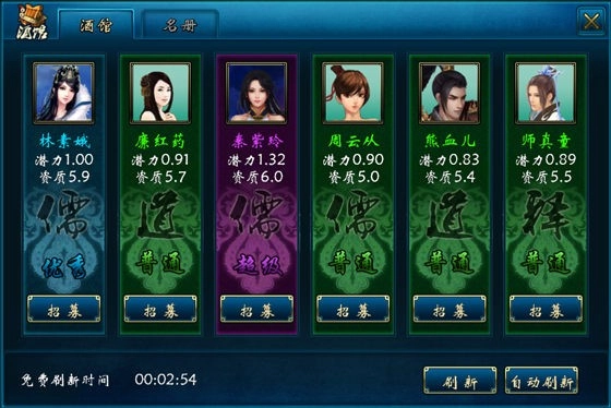 招募界面左下方显示着刷新时间,每小时会有一次免费刷新将领的机会。一旦刷新时间到了,建议直接使用这次机会。酒馆每次刷新会随机出现6名将领。若刷新时间未到,也能通过消耗仙石或礼券手动刷新酒馆。通常手动刷新几次就能获得蓝色品质及以上的散仙;自动刷新功能则支持选择目标将领的品质,还能设置最大刷新次数。需要重点关注散仙的“潜力”与“资质”,这两项属性是衡量散仙实力强弱的关键指标。