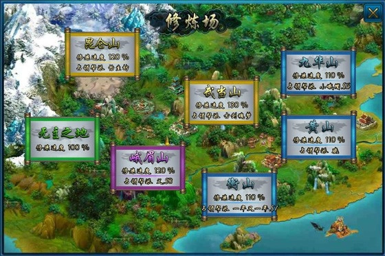 其他六座名山在无帮派占据时,固定提供30个修炼空间。用户进入后挂机修炼,将按照名山默认的加成速度进行,其中峨眉与昆仑山的基本速度提升20%,另外四座的基本速度提升10%。