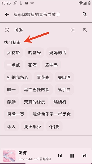 1、打开听海音乐后,可借助顶部的搜索功能进入搜索界面进行歌曲搜索,此外,该页面还会推荐全网当下的热门搜索歌曲。