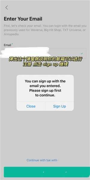 4、弹出这个弹窗就表明你的邮箱具备注册资格,点击signup按钮继续操作