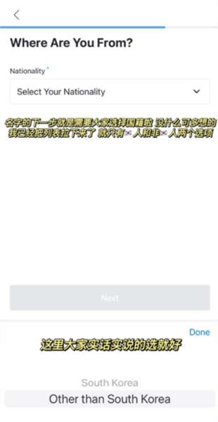 7、选好名字后,接下来就需要大家选择国籍了。这没什么可纠结的,下拉列表里只有“韩国人”和“非韩国人”两个选项。