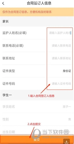 4、填写监护人姓名(为必填项)、联系电话(为必填项)、联系地址,选择对应的证件类型,输入证件号码后,点击“提交”按钮;