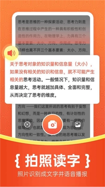 【拍照识读】只需拍摄照片,系统便能自动识别其中文字,并且支持语音朗读功能。