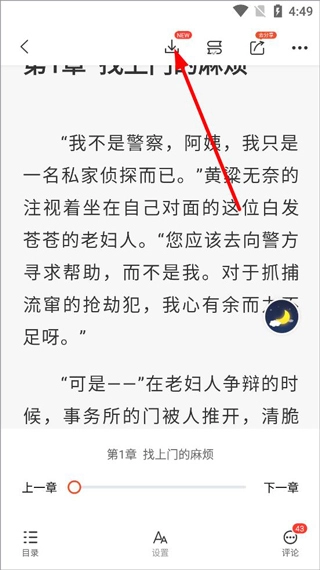 2、打开所需小说,点击页面后上方会出现标识,点击该标识即可。
