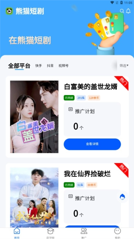 熊猫短剧作为当下市场中备受关注的应用,为用户带来了精彩纷呈的短剧视频体验。不管是弥补错过的内容遗憾,还是想开启全新的视频观看之旅,这里都能精准契合您的需求。平台涵盖了丰富多元的题材,战神、总裁、神医等各类主题应有尽有,足以满足不同用户的喜好。此外,熊猫短剧的视频时长大多控制在1到5分钟,方便用户在紧张忙碌的生活里也能轻松挑选并享受精彩内容。