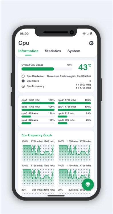 1、实时监测CPU负载信息,精准呈现CPU的各类详细数据,包括CPU温度、运行频率、使用率等,助你随时掌握设备的性能状况。
