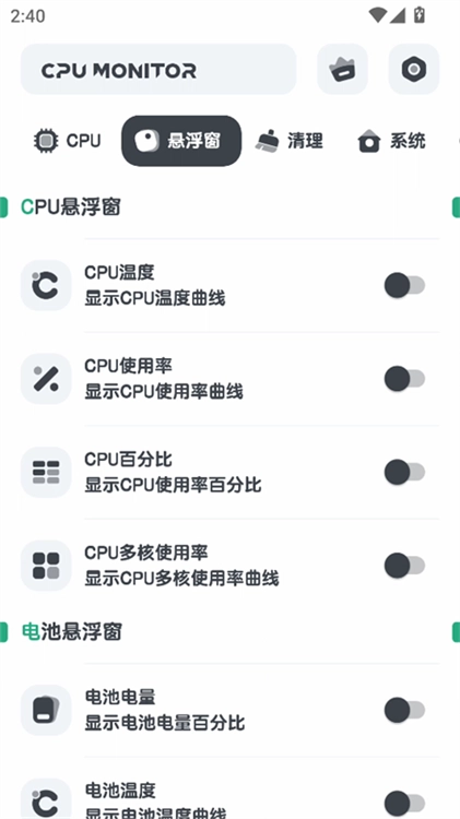桌面悬浮窗口与状态栏悬浮窗口能够实时展示CPU温度、电池温度以及内存利用率。这两类窗口功能完备且操作便捷,若有需要,你可以随时查看这些实时信息。