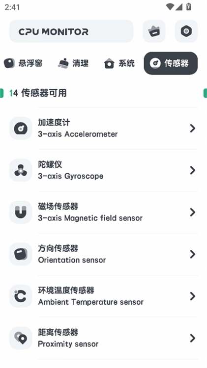 5、在传感器界面中,我们可以获取手机的各类传感器信息,其中涵盖加速度计、陀螺仪、磁场传感器等。