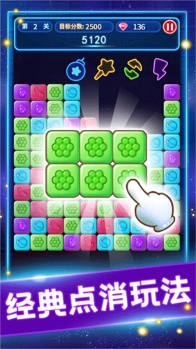 3、多元模式玩法:包含经典、六角、拖动、方块等多种模式,契合不同玩家的消除需求。