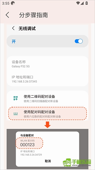 6、随后点击“无线调试”里的“通过配对码完成设备配对”