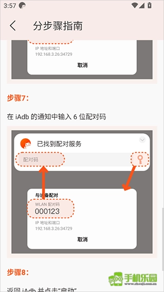 7、在iAdb的通知里输入6位配对码,接着回到iAdb界面点击“启动”按钮就可以了