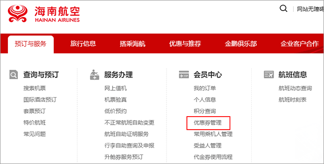 1、进入海南航空官网首页,点击导航栏中的“预订与服务”,在下拉列表中选择“会员中心”栏目下的“优惠券管理”,如下图: