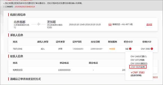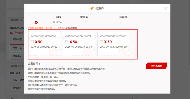 3、绑定成功后,即可在海南航空官网购票时选择该代金券进行支付。具体操作为:选择自己出行的航班及价格,进入旅客信息填写页面,在输入乘机人信息处有使用优惠券按钮,请点击该按钮,然后选择自己所获得的代金券,点击确定,此时系统将自动用代金券金额抵扣相应票款。具体操作如下三图: