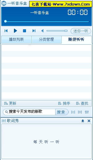 一听音乐盒是国内领先的在线试听网站——一听音乐网推出的一款完全免费的音乐软件,集歌曲搜索、下载、播放、管理、歌词自动配对等众多功能于一身,拥有自主研发的全新音频引擎;是国内功能最强的音乐软件