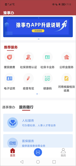 豫事办新版本,底部主菜单栏,由5项简化为3项,将APP服务集中至首屏展示,简化用户使用流程。