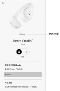 1、在设备屏幕中,电池电量显示在头戴式耳机、入耳式耳机或 Pill+ 扬声器图像的下方。