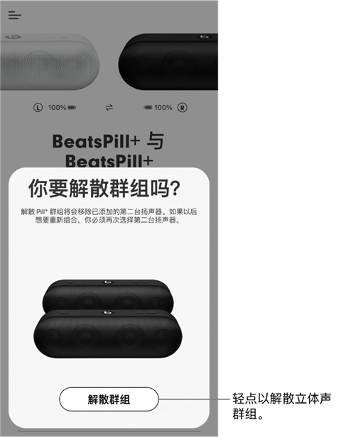使用 Beats App 创建包含两台 Pill+ 扬声器的立体声群组,一台充当左声道,一台充当右声道。