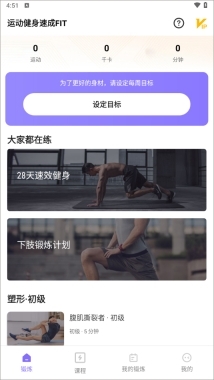 1. 打开app后,不妨先从下方的初级板块入手。若想拥有更理想的身材,还能设定每周目标。