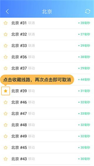4、服务器列表分为“全部”和“收藏”,点击服务器前端“星标”即可收藏线路,再次点击即可取消收藏,收藏的线路保存在收藏。