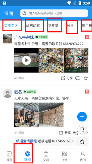 3、如果您希望与纸厂老板进行线下交易,可以点击下方的纸圈,进入纸厂的社交圈,在那里关注纸厂老板的需求动态。这样不仅可以了解到货物的数量,还能对当月的废纸信息进行分析。