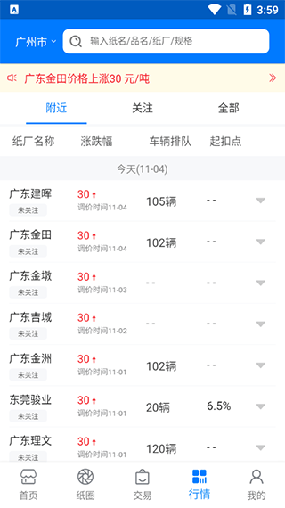 4、若想了解废纸的市场情况,可以点击下方的行情按钮,里面提供了附近纸厂废纸回收价格的变化信息。
