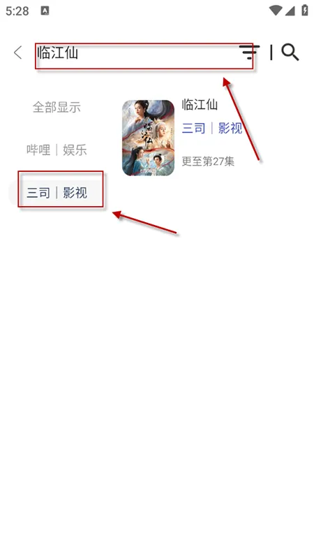 2、点击顶部搜索栏,输入关键词,在搜索结果中选择影视,点击封面播放。