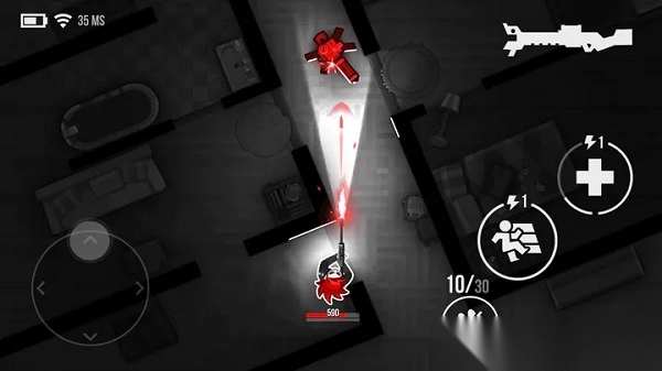 这款游戏没有复杂的剧情设定,纯粹的战术射击体验,与往常所见的大多数fps游戏不同。首先是视角,俯瞰式上帝视角能够让玩家快速了解地形,所处位置;操作上也是极其简单,左手摇杆控制角色移动,右手按键完成换弹、治疗等操作。