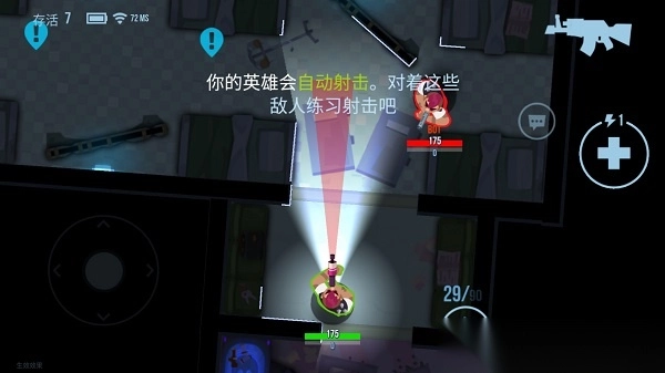 在教程关卡中,前期会有详细教学引导玩家如何移动、攻击、拾取地上物品,并且会安排不会动的靶子敌人对玩家进行射击训练。