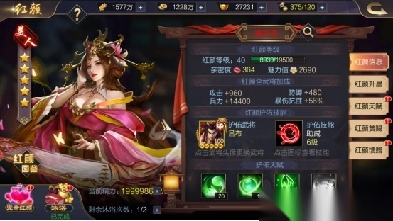 红颜品质:美人、容华、修仪三个品质,品质越高,可为武将提供的属性越多。