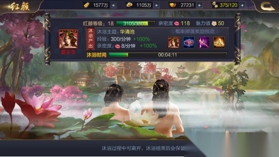 亲密度除了红颜宠幸有一定几率提升外,还可以通过沐浴获得稳定的提升。
